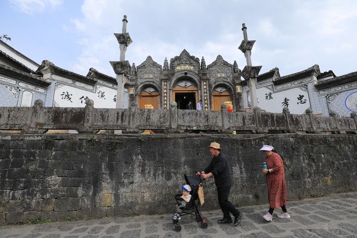 2025年4月23日,在腾冲市和顺古镇,居民从中西合璧建筑风格的寸氏宗祠前走过。宗祠外景石雕、围栏等均用火山岩建造。新华社发(龚祖金摄)