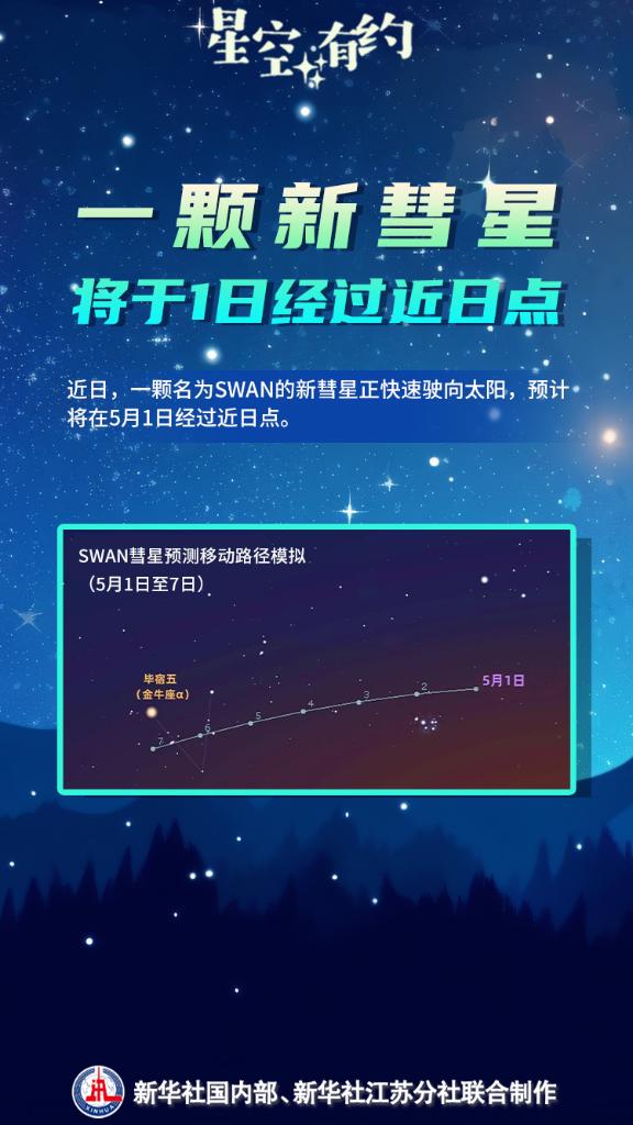 新华社南京4月29日电(记者王珏玢、朱筱)一颗名为SWAN的新彗星正快速驶向太阳。它由欧洲航天局SOHO探测器上的SWAN相机在3月下旬首先观测到,这颗彗星也因此得名。据预测,这颗彗星将在5月1日经过近日点,届时它与地球的距离也将达到最近,亮度预计在7等左右。