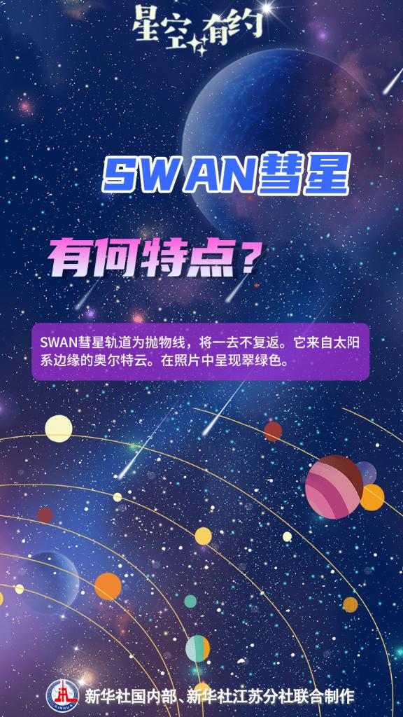 “天文学家通过比较SWAN彗星在各阶段观测中的位置,计算出它的轨道偏心率为1.0000995,轨道为抛物线,将一去不复返。”王科超说,对公众而言,有些彗星几年或几十年能见到一次,有的“一眼万年”,还有的“短暂相逢”后就“一去不返”,成为遥远深空中的永恒“流浪者”,SWAN彗星就属于“一去不返”型。