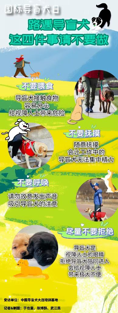 每年4月的最后一个星期三是国际导盲犬日。导盲犬是视障人士“失而复得”的眼睛,它们不仅能引领视障人士出行、参与社会生活,也能为视障人士提供珍贵的情感陪伴。与爱同行,关心导盲犬,关爱视障人士。看图↓路遇导盲犬,这四件事请不要做,让导盲犬及其身后的视障人士真正“无障碍”地融入社会。