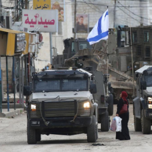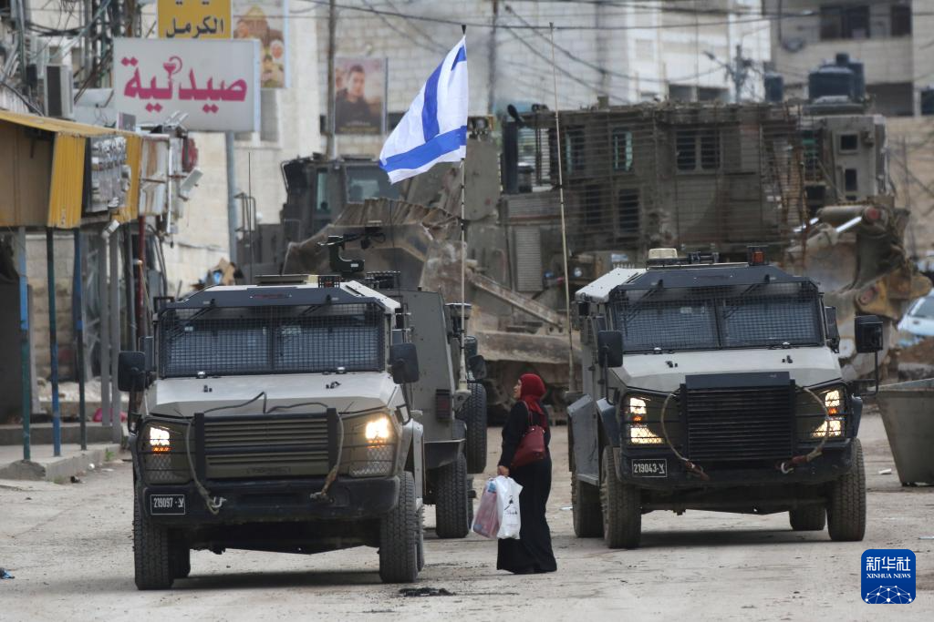 1月22日,在约旦河西岸北部杰宁,一名巴勒斯坦妇女走过以军车辆。新华社发(尼达尔·艾仕塔耶摄)