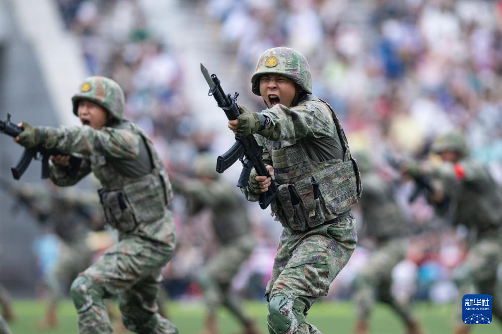 5月1日,中国人民解放军驻澳门部队官兵进行军事训练课目展示。新华社发(张金加 摄)