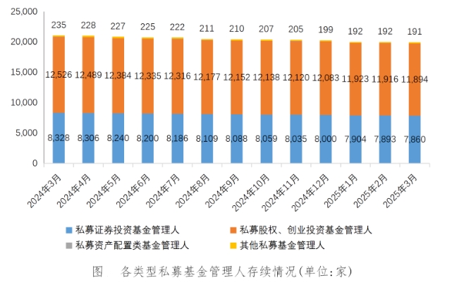 截至2025年3月末,存续私募基金管理人19951家,管理基金数量142278只,管理基金规模19.97万亿元。其中,私募证券投资基金管理人7860家;私募股权、创业投资基金管理人11894家;私募资产配置类基金管理人6家;其他私募投资基金管理人191家。(记者 刘羽佳)