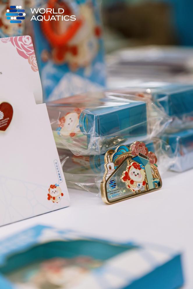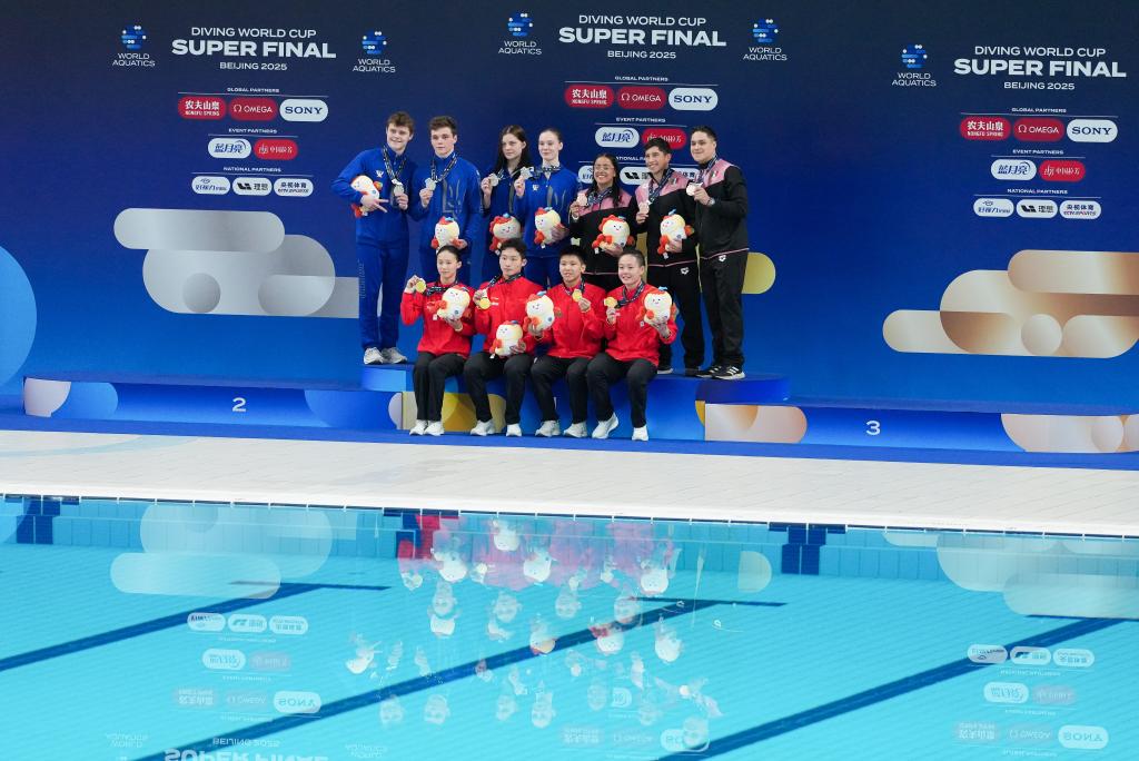 5月2日,在混合团体决赛中,获得冠军的中国队(下)和获得亚军的乌克兰队(上左)以及获得季军的墨西哥队在颁奖仪式上手持吉祥物合影