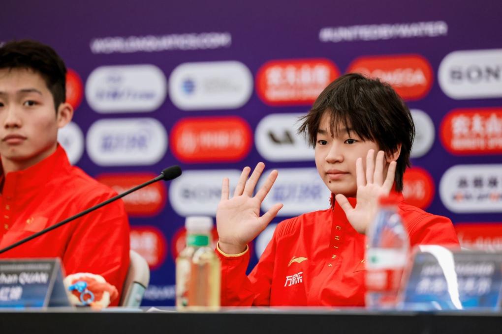 5月2日,中国组合陈芋汐(前)/全红婵在2025年世界泳联跳水世界杯总决赛女子双人10米台决赛中