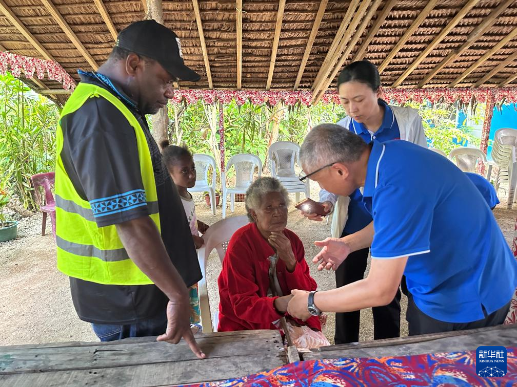 4月25日, 在瓦努阿图桑托岛的一处社区,第三批援瓦努阿图中国医疗队队员为当地居民做检查。 新华社发(第三批援瓦努阿图中国医疗队供图)