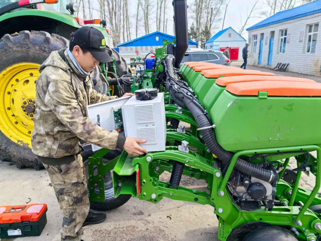 由北林区向北170多公里,在黑龙江省北安市境内的北大荒集团建设农场有限公司,农机手许呈浩正和工友们一起为播种机更换第二代大豆根瘤菌剂喷施中控箱。“今年升级的中控箱里除了菌剂罐,还增加了气泵,如果喷口发生堵塞,可以用气泵直接吹开。”许呈浩说,这台气吹式电控播种机作业十分精准,能把种子按照预设深度精准“打进”土壤。