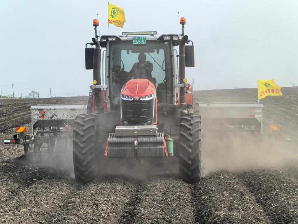 北大荒集团建设农场有限公司旱田地块里正在进行施肥作业。新华社记者黄腾 摄