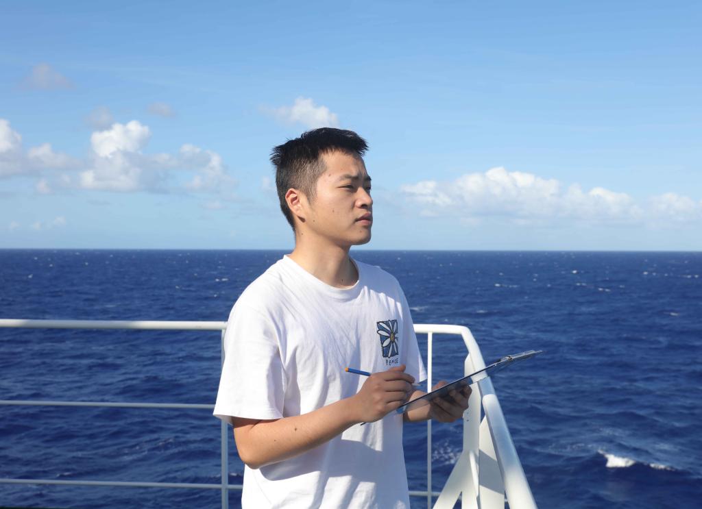 5月2日,随船气象员徐晓武正在甲板进行气象观测。新华社记者 黄韬铭 摄