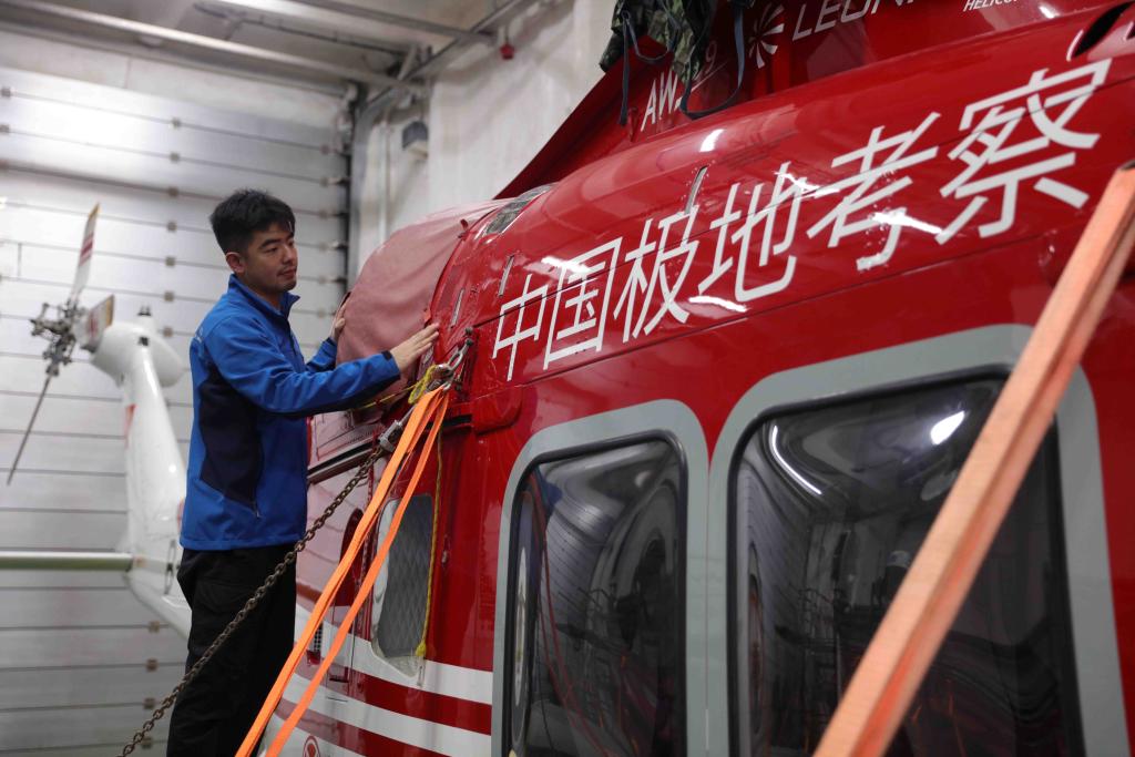 5月2日,考察队员于竞雄在对直升机进行例行安全巡视。新华社记者 黄韬铭 摄