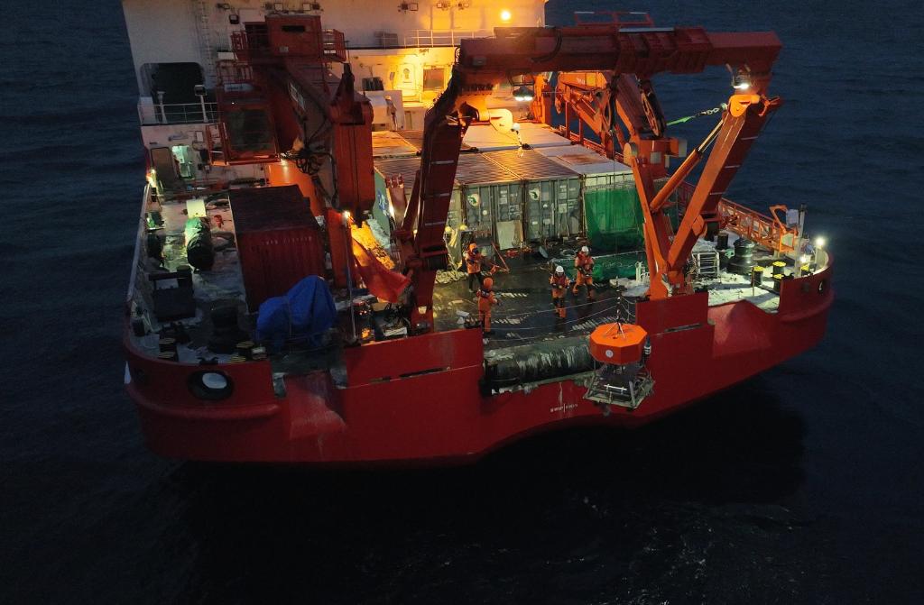 夜间,考察队员在甲板进行大洋作业(无人机照片)。新华社发(梁洲瑞 摄)