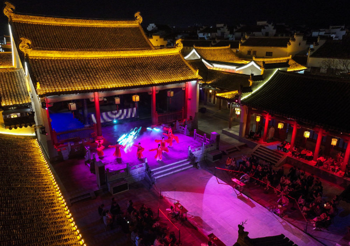2025年3月22日,游客在安徽省黄山市歙县徽州古城观看《徽州府有喜》沉浸式实景演出(无人机照片)。新华社发(施亚磊摄)