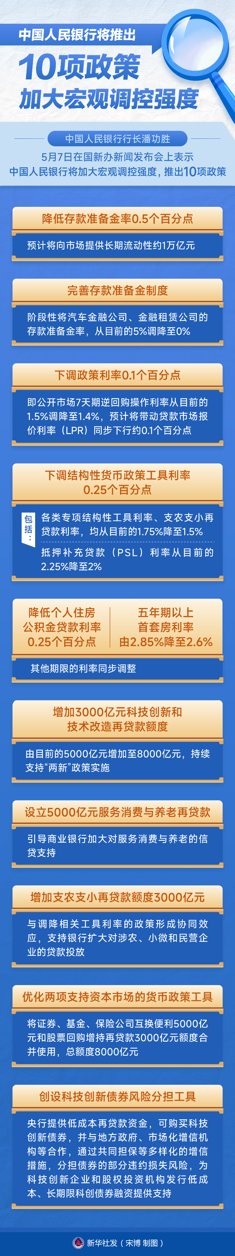 新华社北京5月7日电(记者吴雨、任军)中国人民银行行长潘功胜7日在国新办新闻发布会上表示,中国人民银行将加大宏观调控强度,推出10项政策,进一步实施好适度宽松的货币政策,推动经济高质量发展。