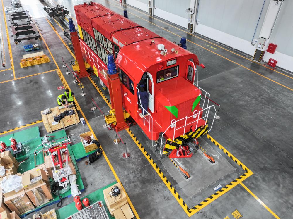 这是4月26日在湖南株洲联诚集团控股股份有限公司新产业事业部车间拍摄的一台准备改造成新能源的机车(无人机照片)。新华社记者陈泽国摄