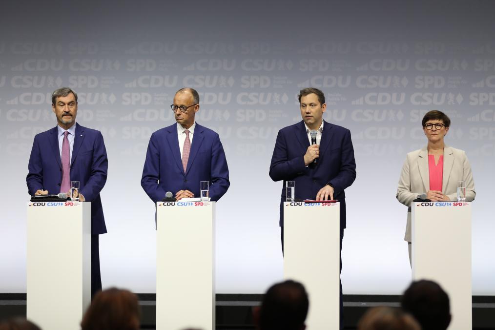 5月5日,在德国柏林,德国基督教社会联盟(基社盟)领导人索德尔(左一)、德国联盟党总理候选人弗里德里希·默茨(左二)、德国社民党联合领导人拉尔斯·克林拜尔(右二)和萨斯基娅·埃斯肯(右一)共同出席德国联盟党与社民党联合执政协议签署仪式。新华社记者 杜哲宇 摄