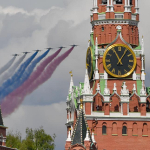 5月7日,在俄罗斯首都莫斯科,战机编队参加纪念苏联伟大卫国战争胜利80周年阅兵式彩排。