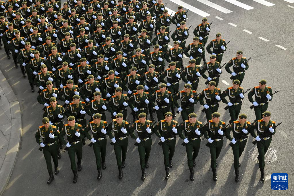 5月7日,在俄罗斯首都莫斯科,士兵列队准备参加纪念苏联伟大卫国战争胜利80周年阅兵式彩排。
