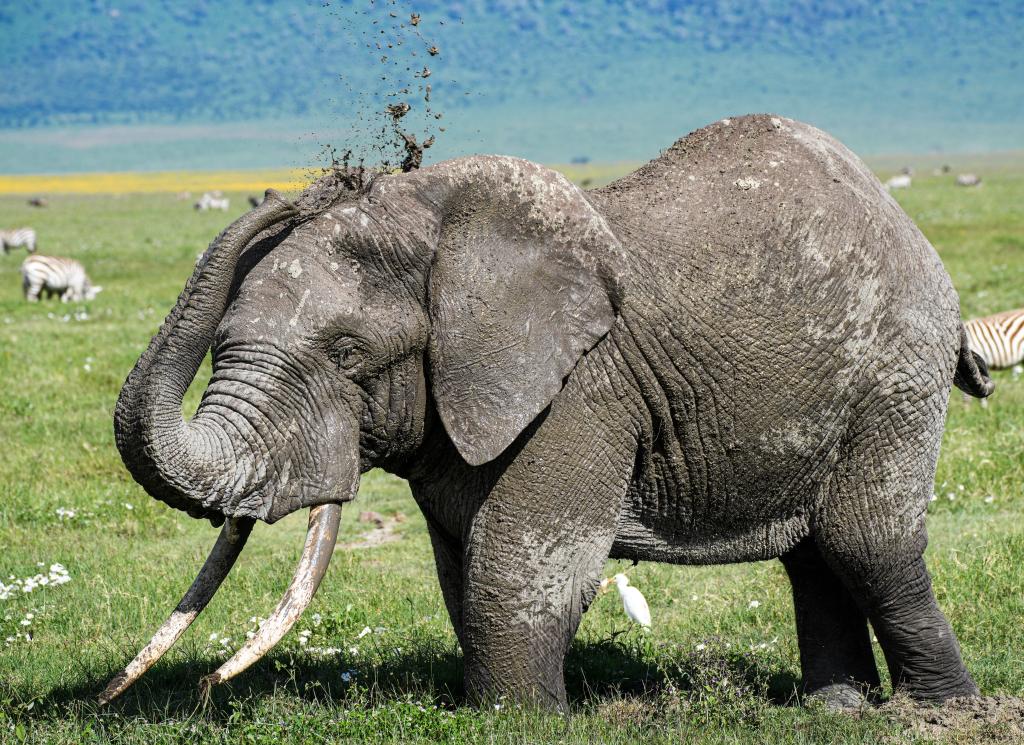 2025年4月26日,在坦桑尼亚恩戈罗恩戈罗自然保护区,一头大象往自己身上喷涂泥巴。新华社记者 李亚辉 摄