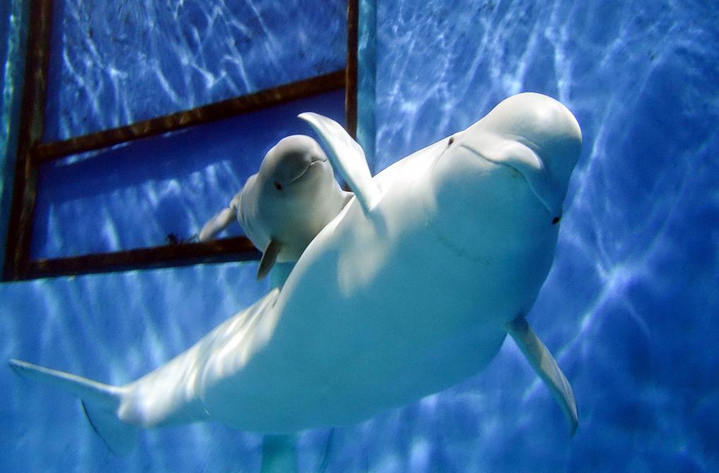 2019年1月18日,白鲸妈妈尤利娅带着它的宝宝在珠海长隆鲸豚繁育基地玩耍。 新华社记者刘大伟摄