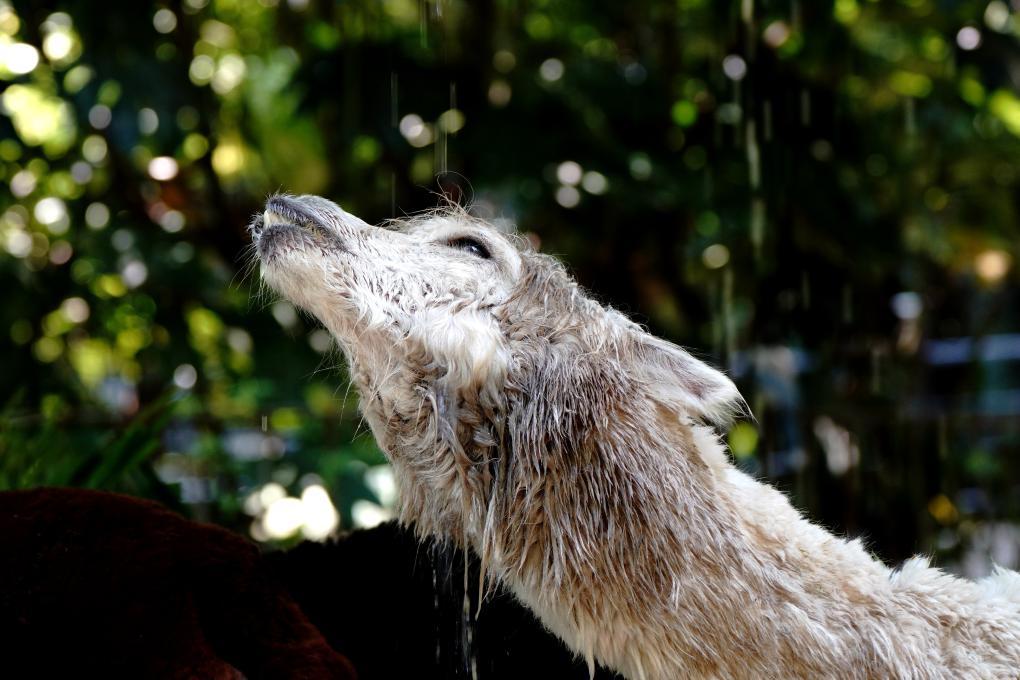 2022年8月13日,上海动物园的一只羊驼在享受喷淋降温。 新华社记者 张建松 摄
