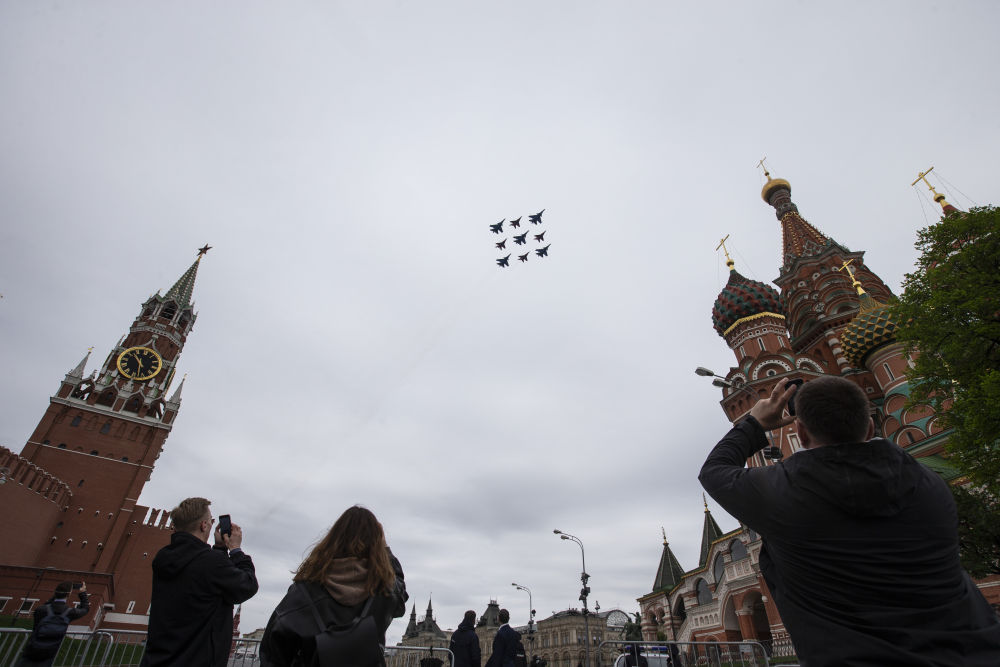2018年5月9日,在俄罗斯莫斯科举行的纪念卫国战争胜利73周年阅兵式上,战机编队飞过红场上空。新华社发(叶甫盖尼·西尼岑摄)