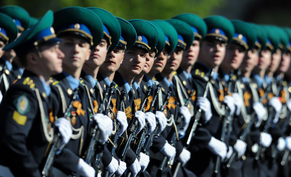 2014年5月9日,士兵在俄罗斯莫斯科举行的纪念卫国战争胜利69周年阅兵式上接受检阅。新华社记者 贾宇辰 摄