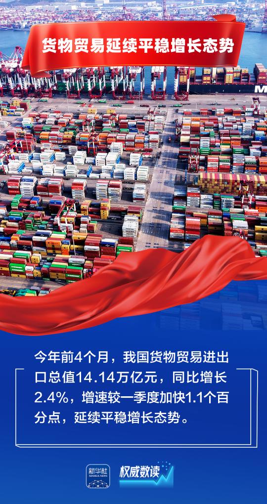 海关总署9日发布数据显示,今年前4个月,我国货物贸易进出口总值14.14万亿元,同比增长2.4%,延续平稳增长态势。其中,出口机电产品5.04万亿元,增长9.5%,占出口总值的60.1%。