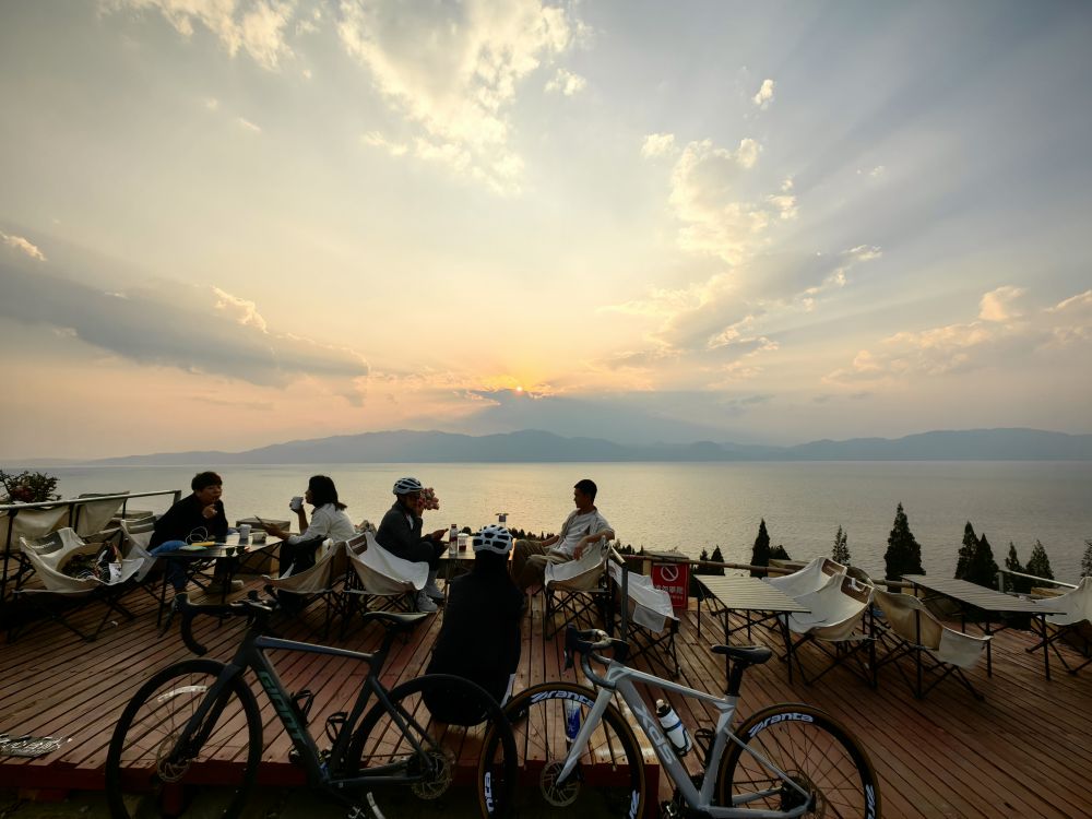 在抚仙湖边一处咖啡馆,人们看落日品咖啡。