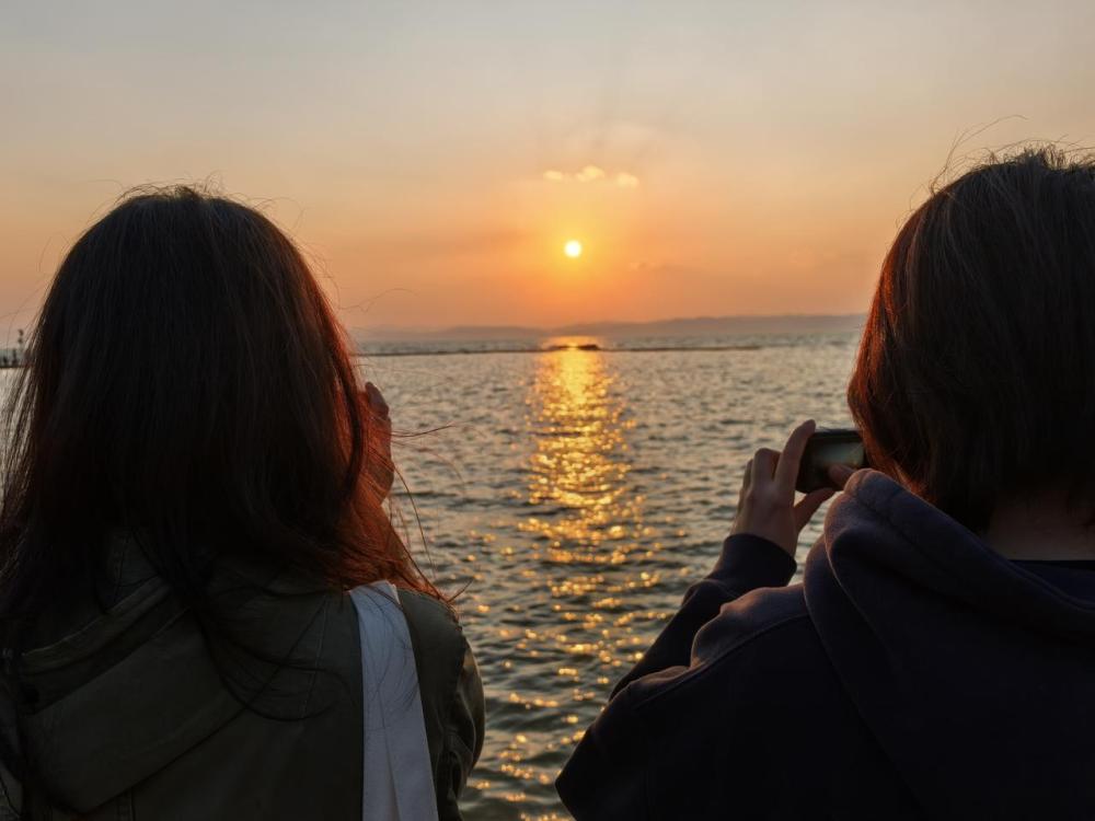 2025年3月25日,两名游客在海晏村拍摄落日。受访者供图