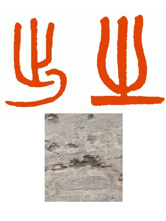 图中分别是篆书“出”(上左)、篆书“之”(上右)和铭题争议之字(下中)。