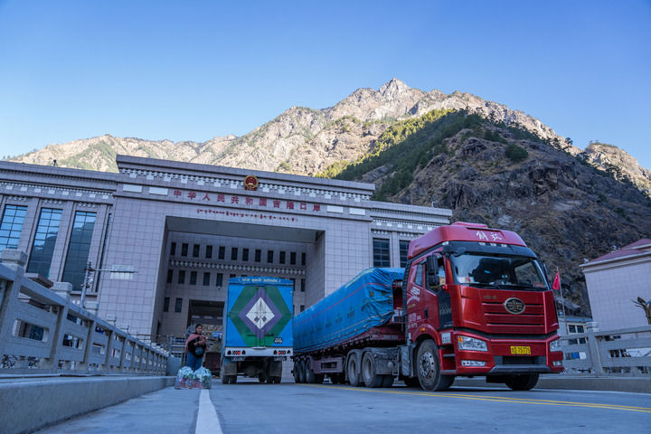 这是日喀则市吉隆口岸,中尼两国的货车和尼泊尔边民正在进出海关。2025年1至2月,吉隆口岸进出口贸易总值7.84亿元,同比增长73.01%(2024年12月15日摄)。新华社记者 丁增尼达 摄