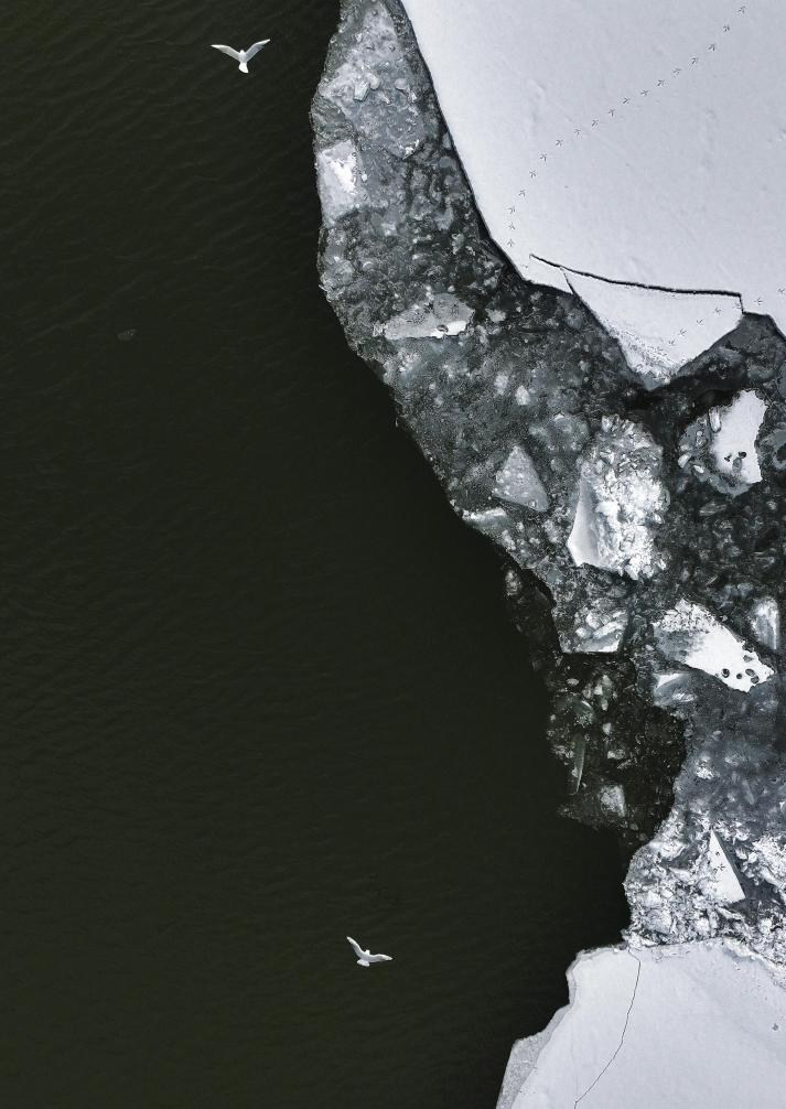 3月30日,在松花江哈尔滨段一处水域,红嘴鸥飞过正在融化的冰排(无人机照片)。 新华社发(张树 摄)