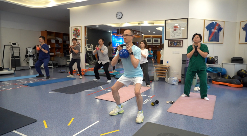 清晨7点15分,记者来到华山医院浦东院区的运动康复中心,“30斤俱乐部”的招牌下已聚集了十余名身着白大褂或洗手衣的医护人员。运动医学科主管技师孙扬手持计时器,一边催促同事加快动作,一边示范着标准姿势:“大家抓紧时间动起来,门诊开始前准时结束!”热身、拉伸、哑铃训练……平日手术台上沉稳干练的医生们,此刻在瑜伽垫上发出阵阵“惨叫”。“坚持住,还有两组!”孙扬的鼓励声夹杂着喘息,汗水浸透的T恤成了这群“减肥战友”无声的勋章。