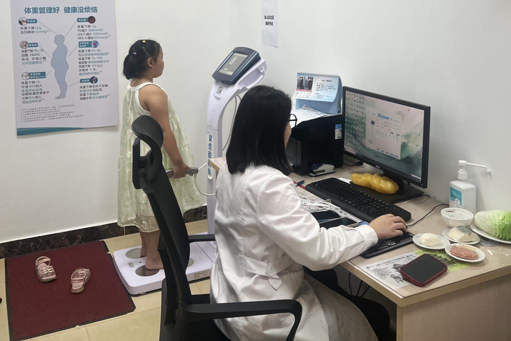 广东省妇幼保健院体重管理门诊医生为儿童进行体重管理指导。新华社发