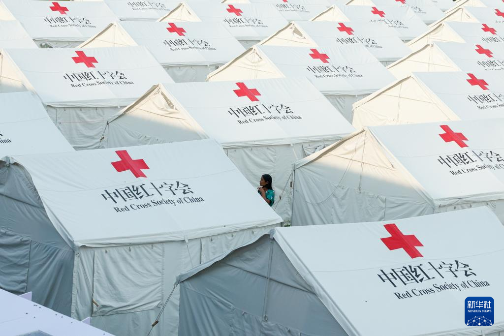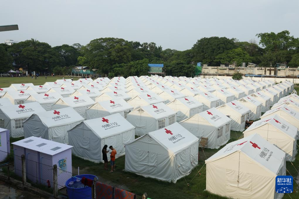 这是位于缅甸曼德勒城内足球场的一个地震灾民安置点,数十个白色救灾帐篷整齐搭建在绿茵茵的足球场上,帐篷顶上的“中国红十字会”字样格外醒目。