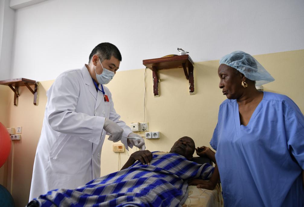 2025年4月29日,在位于几内亚首都科纳克里的中几友好医院,中国医疗队医生刘路遥为患者做针灸治疗。新华社记者韩旭摄