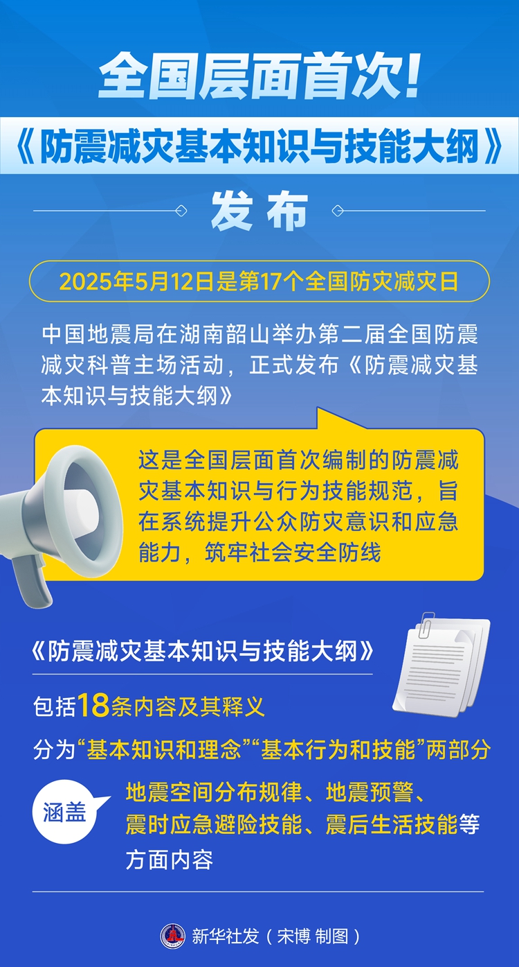 现场发布的《防震减灾基本知识与技能大纲》包括18条内容及其释义,分为“基本知识和理念”“基本行为和技能”两部分,涵盖地震空间分布规律、地震预警、震时应急避险技能、震后生活技能等方面内容。