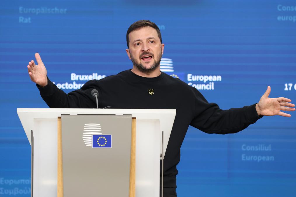 2024年10月17日,在比利时布鲁塞尔,乌克兰总统泽连斯基在欧盟峰会上参加新闻发布会。新华社记者赵丁喆摄