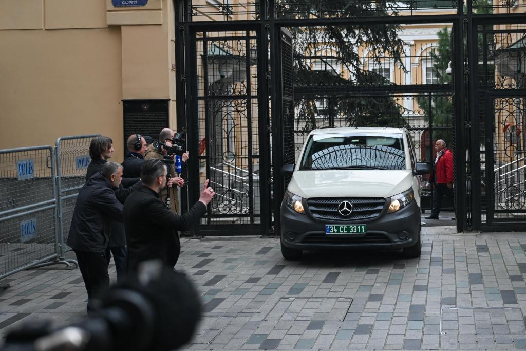 4月10日,在土耳其伊斯坦布尔,载有美国代表的车辆驶离俄罗斯驻伊斯坦布尔总领馆。新华社记者刘磊摄