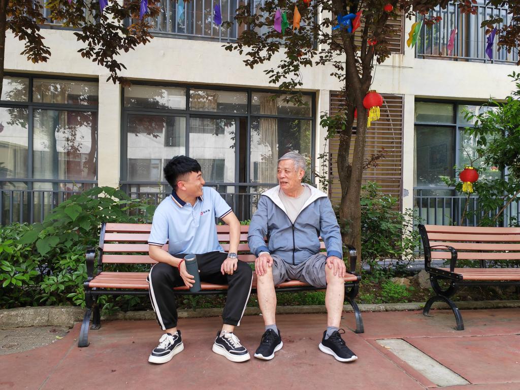 5月9日,陈胜(左)在贵州省贵阳市观山湖区养老服务中心与老人交流。新华社记者 吴思 摄