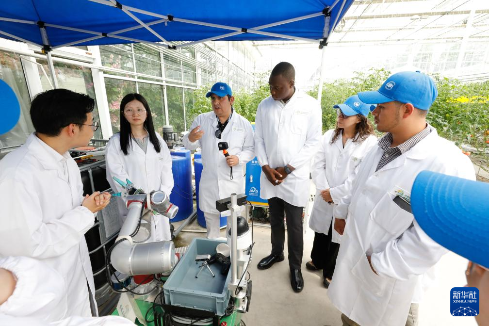 2024年5月22日,“中国—FAO南南合作拉丁美洲和加勒比地区农村生计改善和粮食体系转型能力建设活动”学员赴江苏省农业科学院开展交流,在江苏省农科院科研温室展示区的农业信息馆中,专家向学员介绍智慧农业研究团队自主研发的智能采摘机器人(番茄)。新华社发(江苏省农业科学院供图)