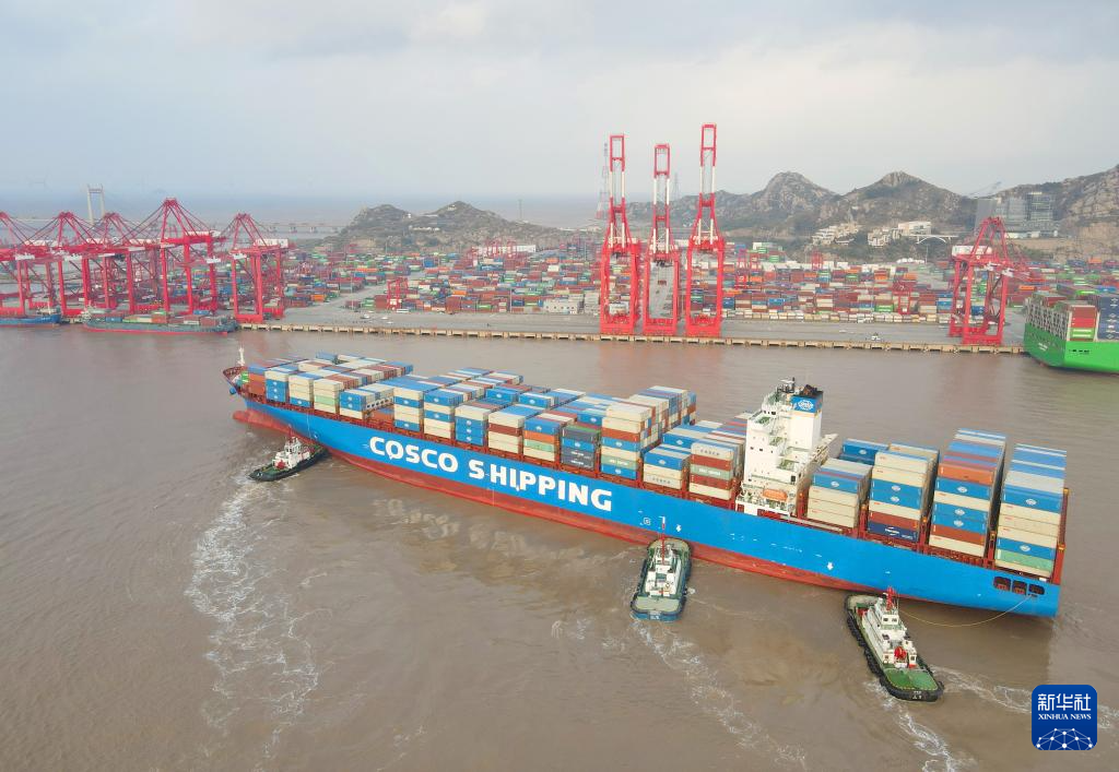 2024年12月18日,“新上海”轮在靠泊上海洋山港码头(无人机照片)。这是自秘鲁钱凯港开港后首个“钱凯—上海”正式航次。新华社记者 方喆 摄
