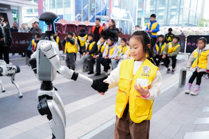 2025年3月15日,在杭州文三数字生活街区的文三科技研学活动上,学生正在与机器人握手。受访对象供图