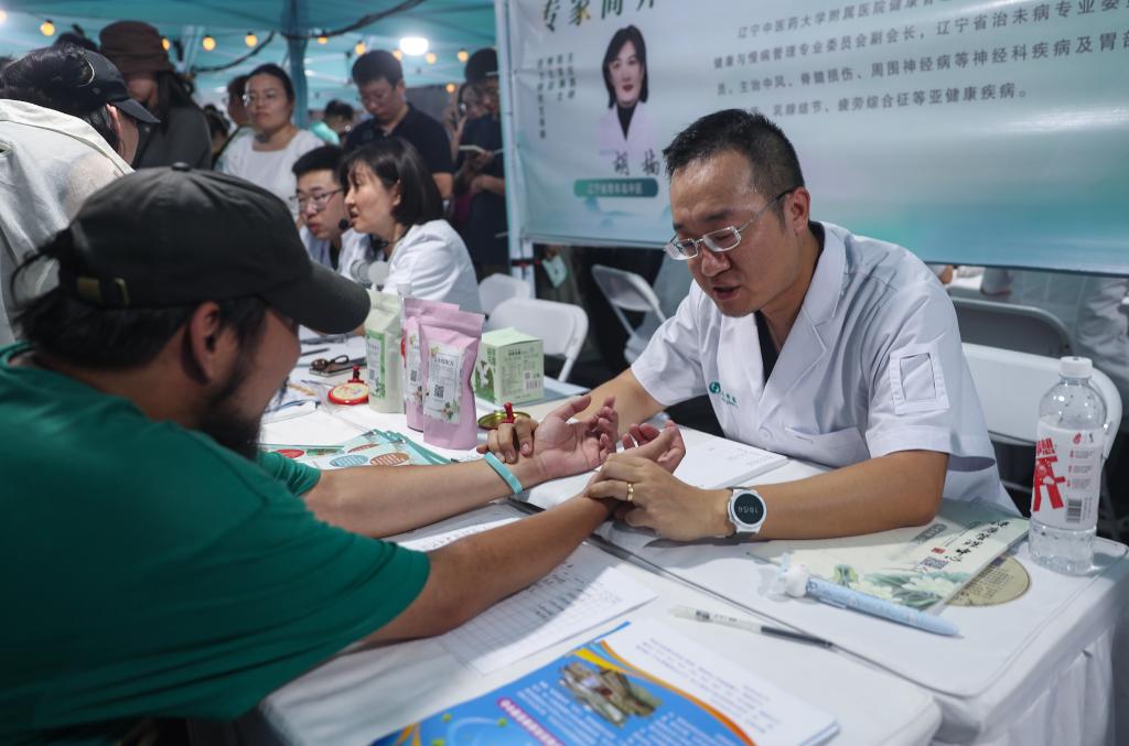2024年8月9日,在中医药文化夜市的义诊区域,医生为患者号脉。新华社记者 龙雷 摄