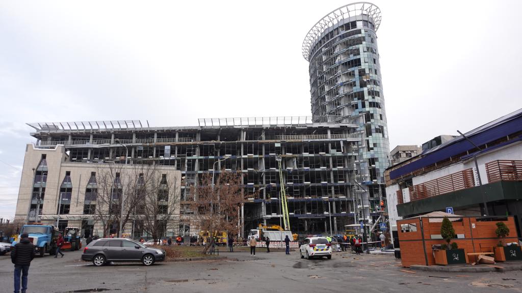 这是2025年1月18日拍摄的乌克兰首都基辅市舍甫琴科夫斯基区一栋遭“伊斯坎德尔”导弹袭击的办公大楼。新华社记者李东旭摄
