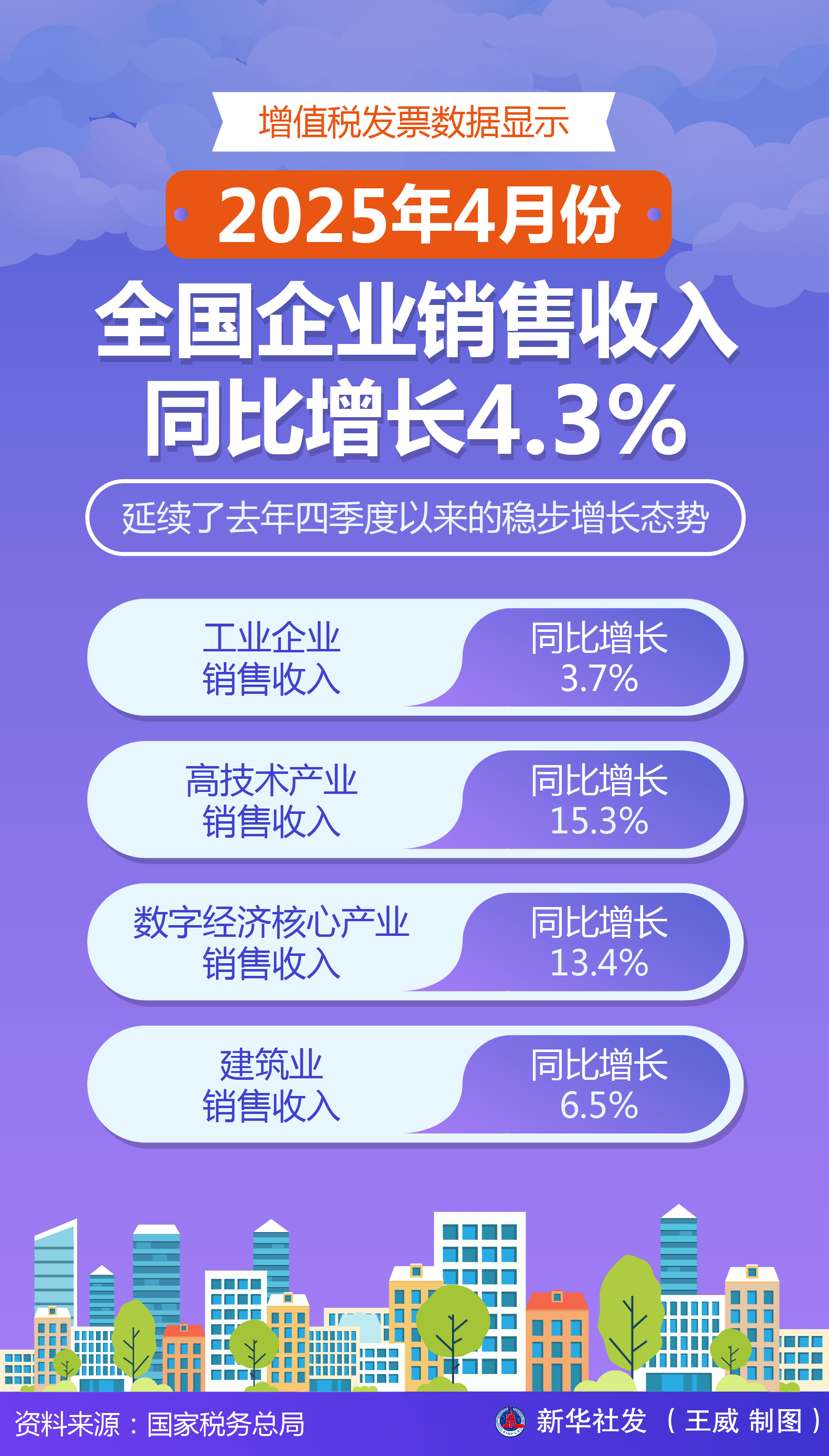 新华社北京5月14日电(记者申铖)记者14日从国家税务总局了解到,增值税发票数据显示,4月份,全国企业销售收入同比增长4.3%,延续了去年四季度以来的稳步增长态势。