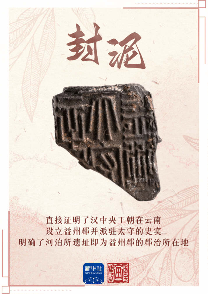 河泊所遗址考古领队、云南省文物考古研究所研究馆员蒋志龙介绍,包括“滇国相印”“滇王相印”“益州刺史”“益州太守章”“犍为太守章”等与滇国、益州郡、益州郡下辖县、益州郡周边郡治有关的官印封泥,是西汉中央政府对西南边疆实施长期有效行政管辖的直接证据,证实了《史记》《汉书》中“置益州郡,领二十四县”的记载。