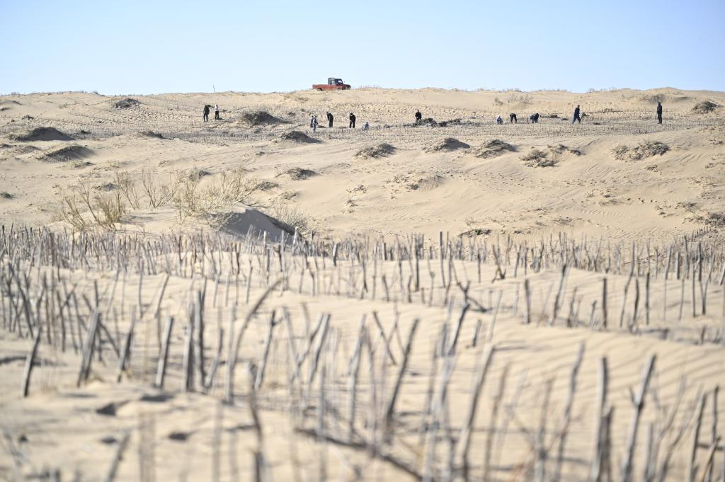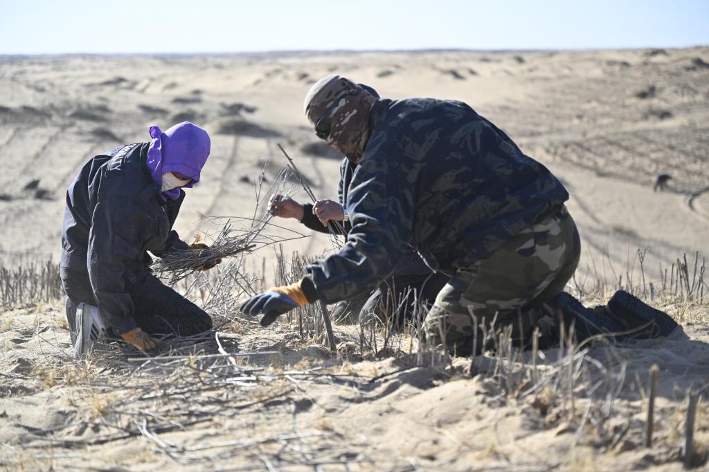 浑善达克沙地上工人们在加紧治沙。新华社记者 贺书琛 摄