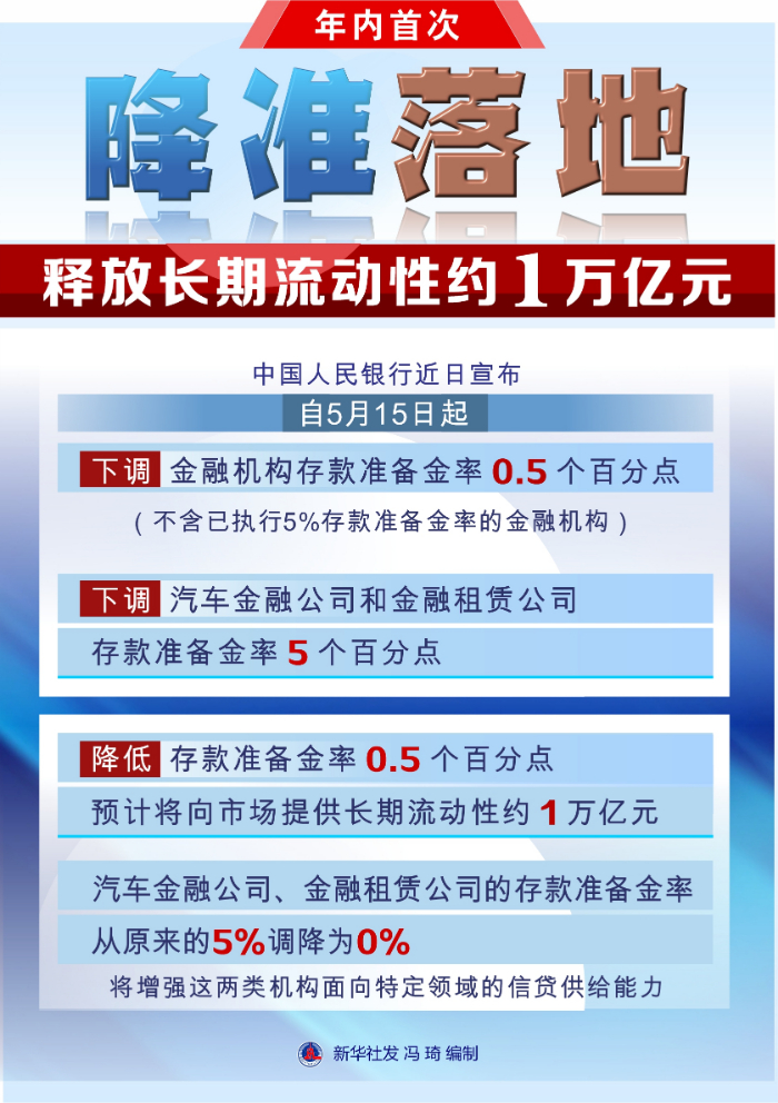 中国人民银行近日宣布,自5月15日起,下调金融机构存款准备金率0.5个百分点(不含已执行5%存款准备金率的金融机构),下调汽车金融公司和金融租赁公司存款准备金率5个百分点。