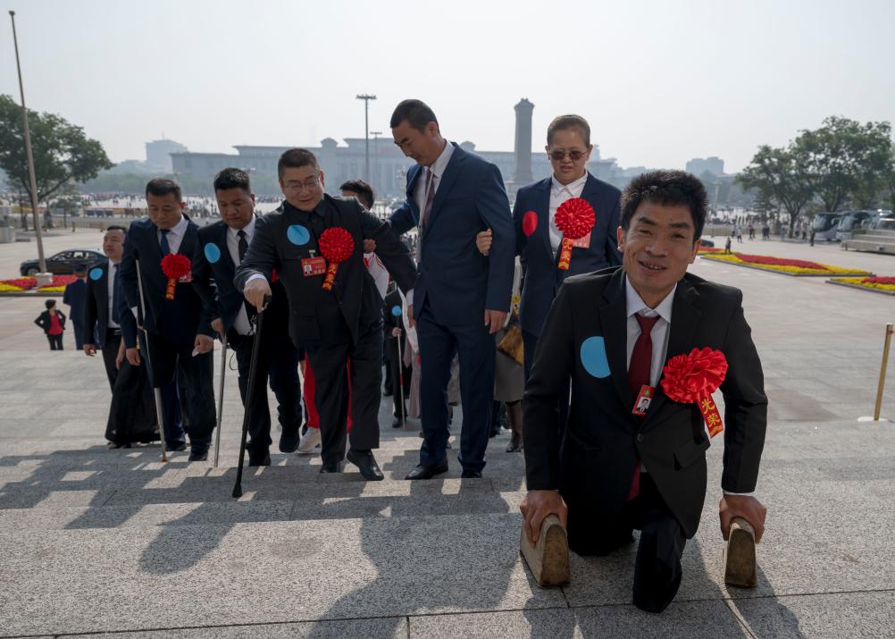 5月16日,参加第七次全国自强模范暨助残先进表彰大会的何木林(前右一)双手撑着小板凳“迈”上大会堂台阶,他荣获“全国自强模范”称号。新华社记者才扬 摄